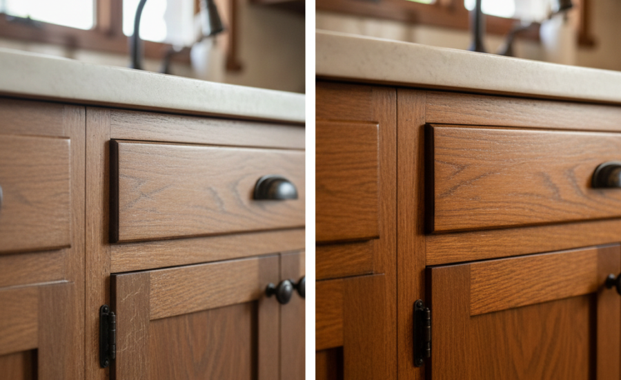 This might surprise homeowners: properly refinished cabinets often look better than new mid-range cabinets. The reason lies in application method.